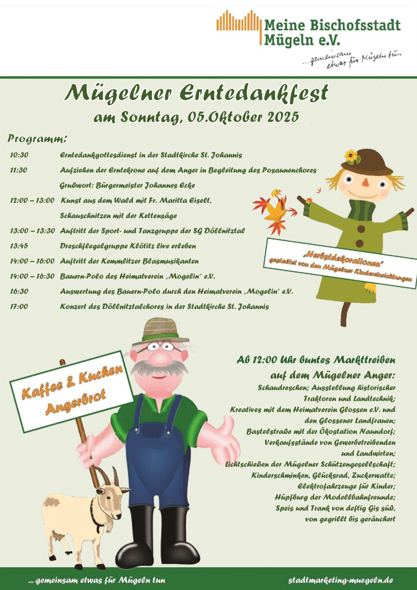 Wir laden alle Mügelner und Gäste recht herzlich zum 9. Mügelner Erntedankfest am Sonntag, dem 03.10.2021 mit bunten Markttreiben auf den Anger ein.